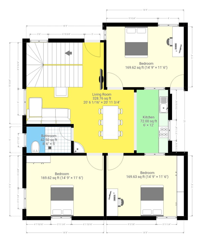- Each room’s dimensions are clearly mentioned, ensuring enough space for furniture and movement.