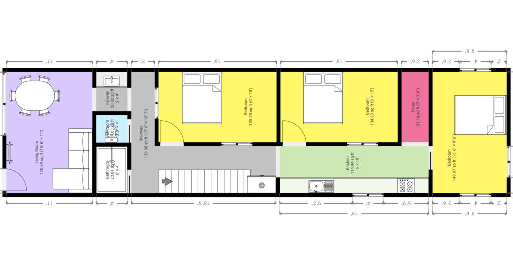 This is a plan for a plot that has only front side road. Not too wide, but has some length.